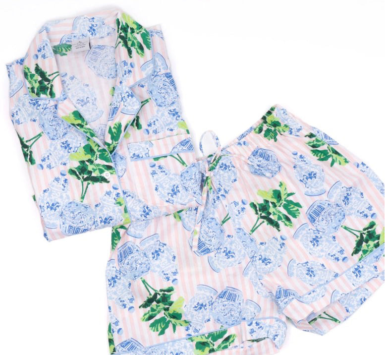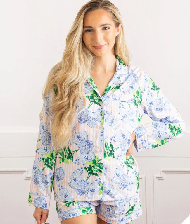 Sleep in style with our Ginger Fig Stripe Pajama Set. Crafted from 100% woven cotton, this set is designed to keep you comfortable so you can make the most of your rest. This elegant short set features a button-front long sleeve top and drawstring waist shorts with the classic allure of a botanical ginger jar print, making it the perfect choice for any occasion. Slip into your own piece of elegance with our Ginger Fig Stripe Pajama Set today!