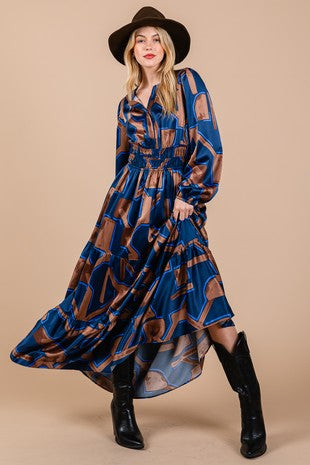 Ces Femme Geometric Print Tiered Maxi Dress Navy/Brown