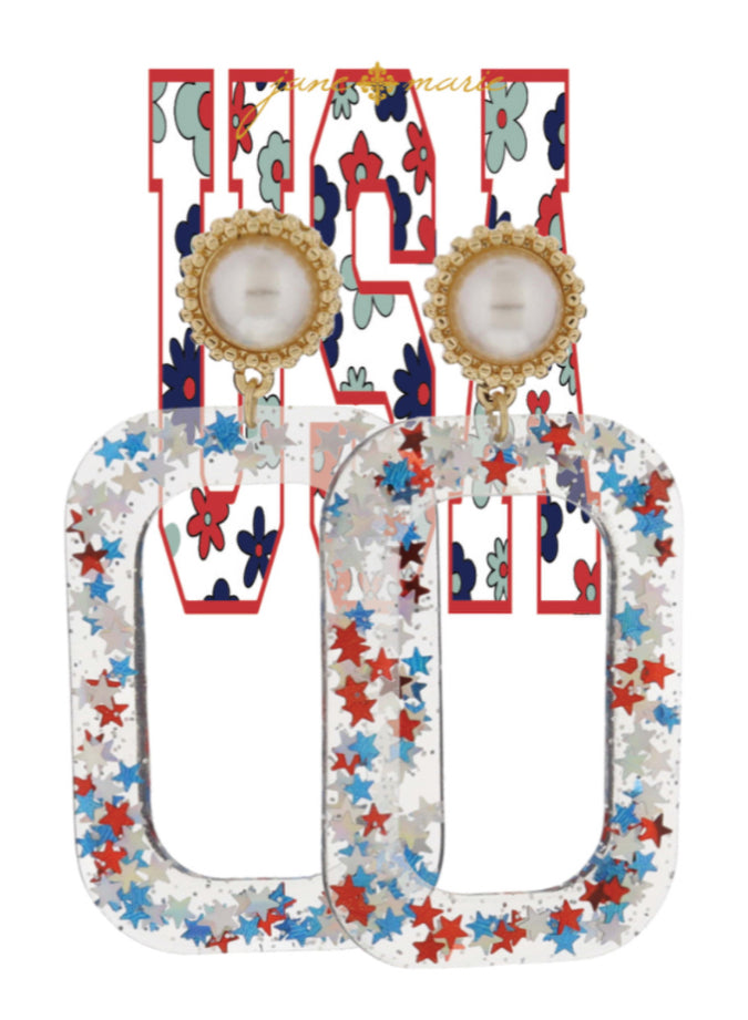 Jane Marie Gold Studded Pearl Post and clear with red/ blue Glitter Open Rectangle Jm70558E-4