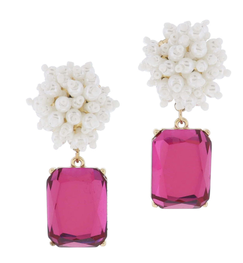 Jane Marie Pearl and White Beaded Pom Post with Large Fuchsia Emerald Crystal Earrings