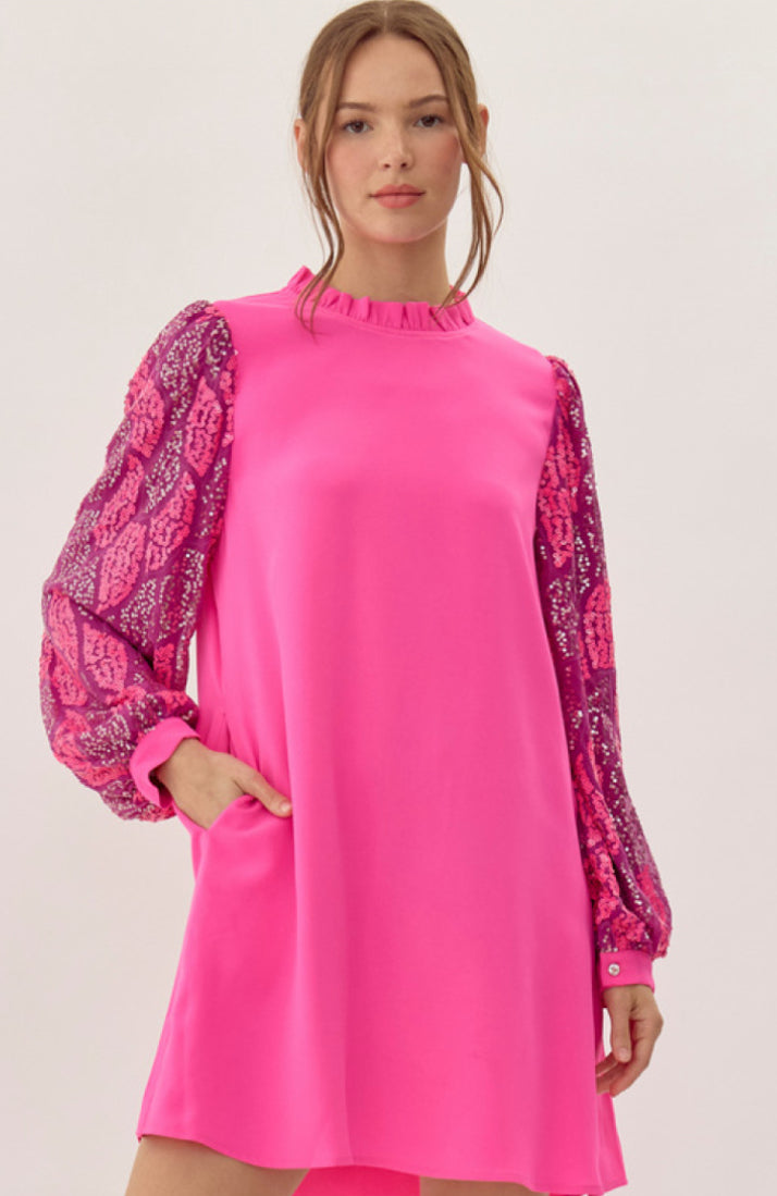 Jodifl Hot Pink Dress With Sequin Sleeves