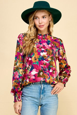 Les Amis Floral Top With Mock Neck And Smocked Sleeves