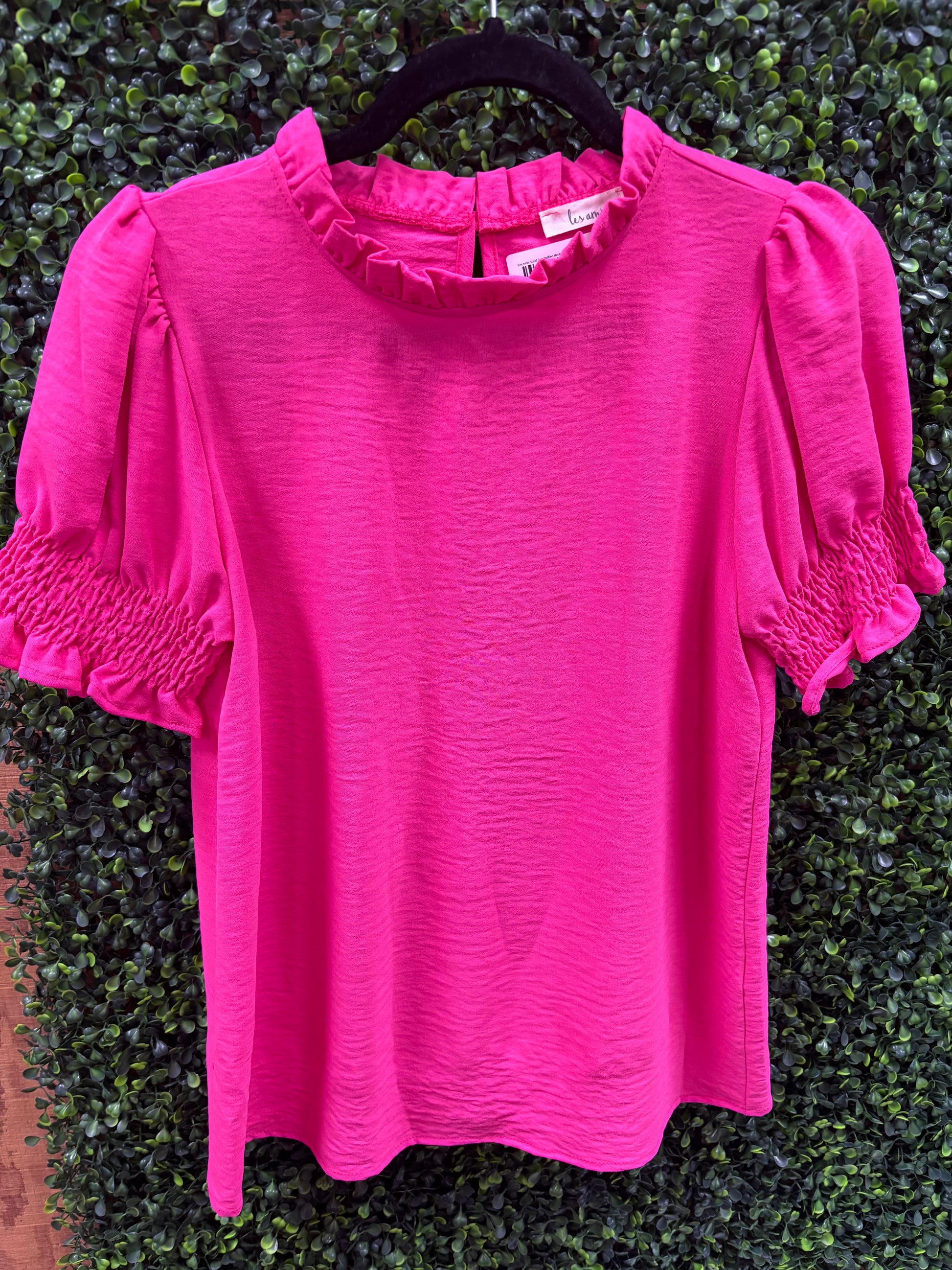 Les Amis Solid Top Ruffled Neck Detail With Smocked Sleeves Hot Pink