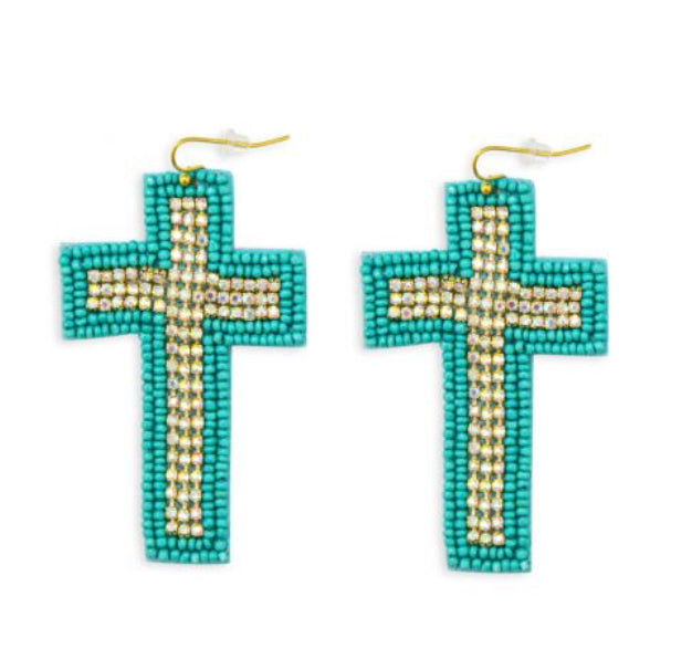 Myra Bag Beaded Cross Dangle Earrings In Teal