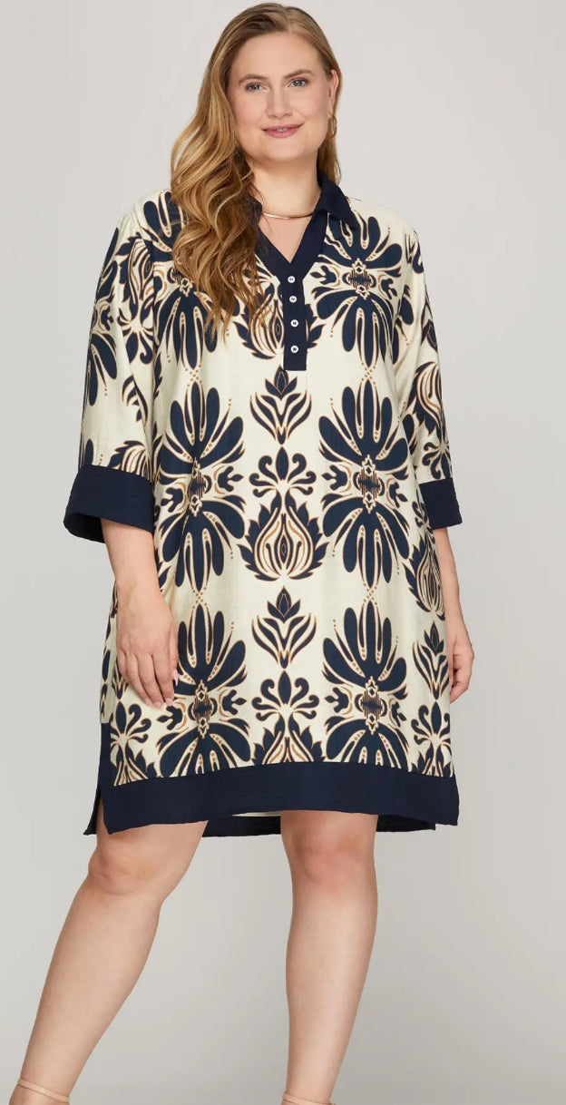 She + Sky 3/4 SLEEVE HALF ZIP STRIPED TOP Navy